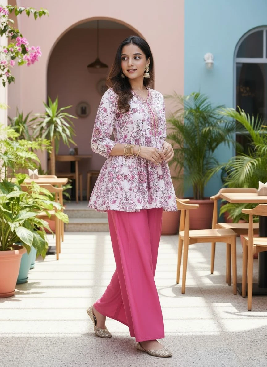 The beautifully printed short kurti is made from premium Modal Satin fabric, offering a soft touch and graceful fall, while the palazzo in French Crepe ensures comfort with a stylish flow. With its classy design and rich fabric quality, this outfit is perfect for festive days, family gatherings, and elegant casual occasions.