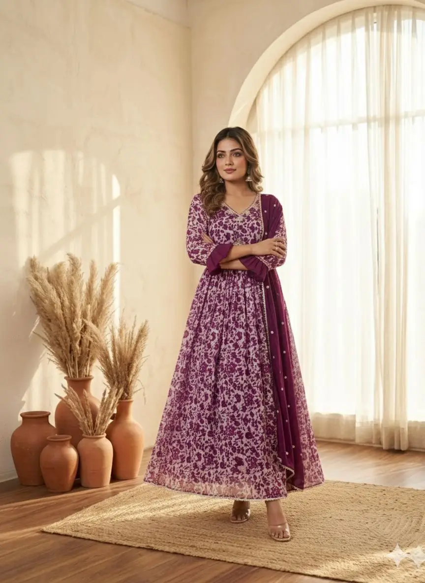 Bring home festive elegance with this stunning purple floral printed Pakistani style Anarkali gown with dupatta for women. Crafted in lightweight georgette fabric with full inner lining, this gown features beautiful sequence embroidery work on the neckline and a matching embroidered dupatta with lace border. The flowy Anarkali flare and graceful Pakistani pattern make it perfect for festivals, family functions, small gatherings, and special occasions. Comfortable, stylish, and trendy – this gown dupatta set is a must-have for festive season fashion.