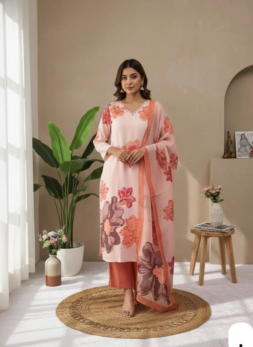 Upgrade your ethnic wardrobe with this light pink floral cotton salwar kameez set for women. This beautiful suit features a soft cotton kurta with floral print, stylish V-neck mirror work detailing, and three-quarter sleeves for a classy look. It is paired with peach color pants and a matching floral printed dupatta, making it ideal for daily wear, office wear, festive wear, casual outings and small functions. Lightweight, breathable and comfortable, this designer cotton salwar suit is perfect for summer wear and all-day comfort. Available in M, L, XL, XXL and 3XL sizes. Best choice for women looking for latest ethnic wear, floral suits, cotton suits online, and trendy salwar kameez designs.