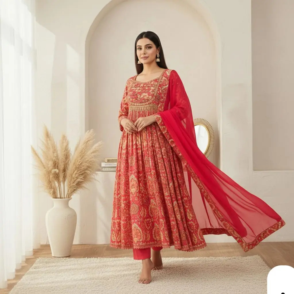 Pair it with juttis, heels or traditional jewellery to complete your festive look. A must-have for women who love stylish ethnic wear, printed Anarkali suits and traditional Indian outfits.