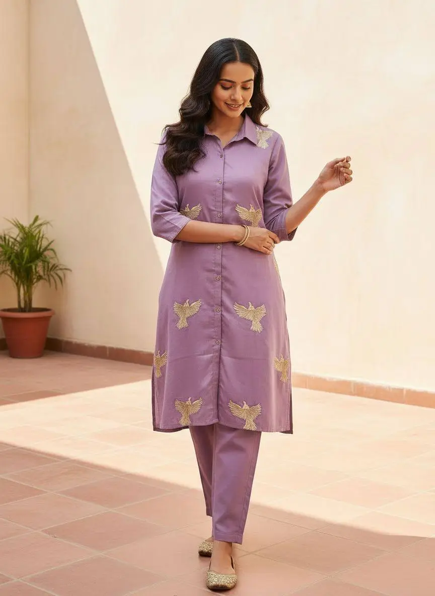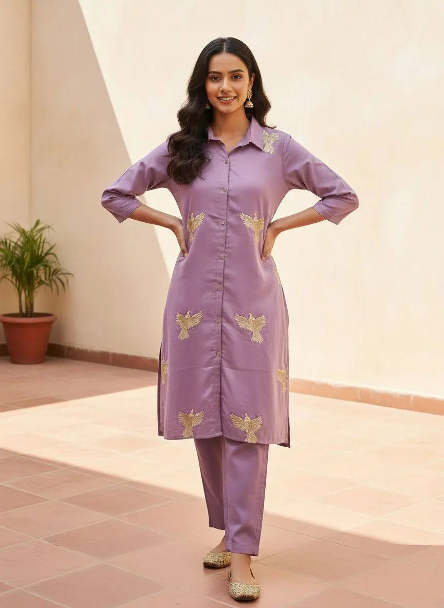 Lavender kurta pant set for women with bird embroidery, elegant ethnic wear for daily and festive use